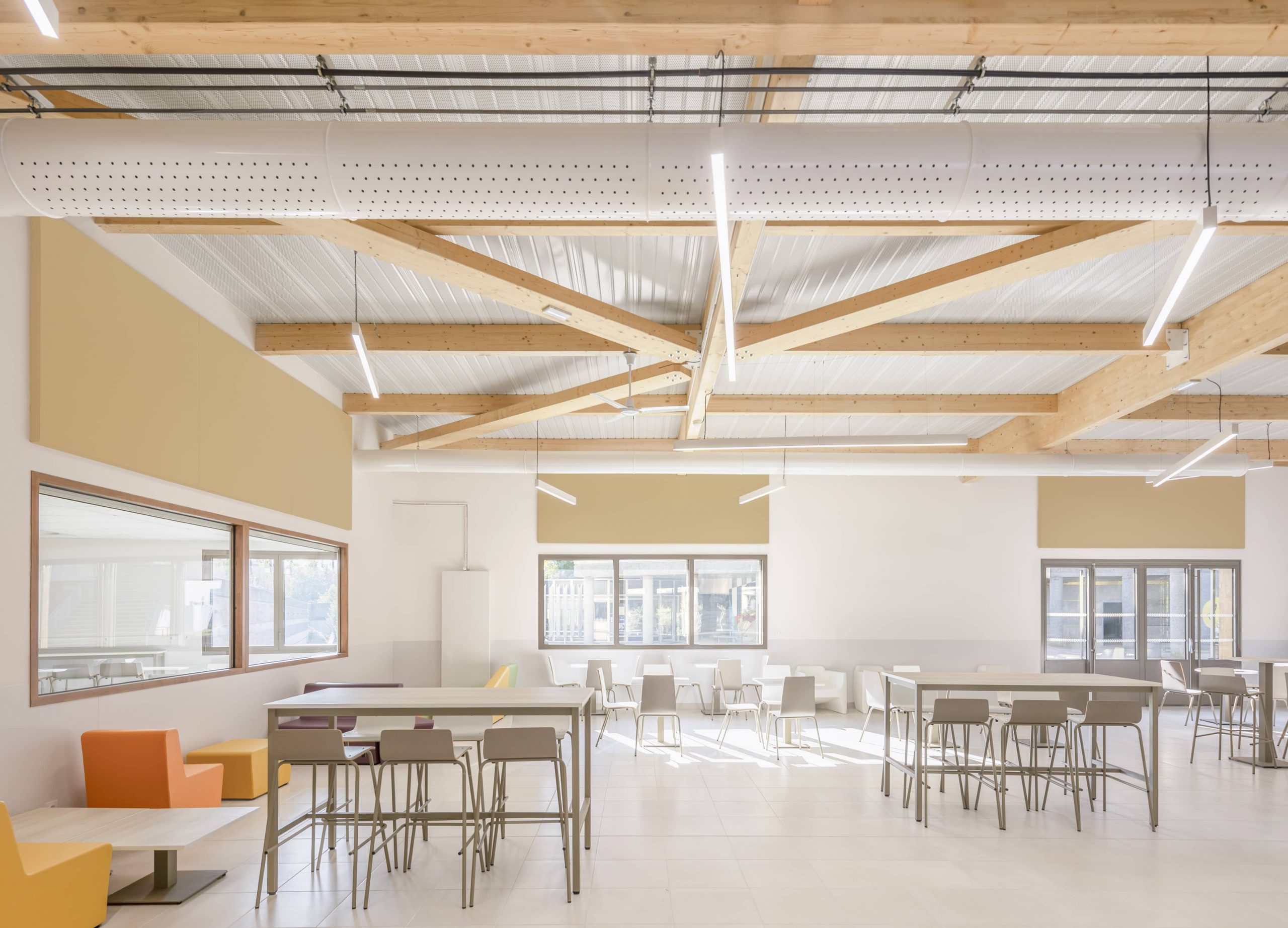 Avec son fonctionnement adapté aux flux du lycée et à l’ensoleillement du site, ses lignes simples mais marquantes et sa volumétrie compacte, la nouvelle construction sait exister sur le site tout en étant à une échelle juste. Elle s’intègre au cadre bâti et paysager du lycée tout en offrant de nouveaux usages au site.